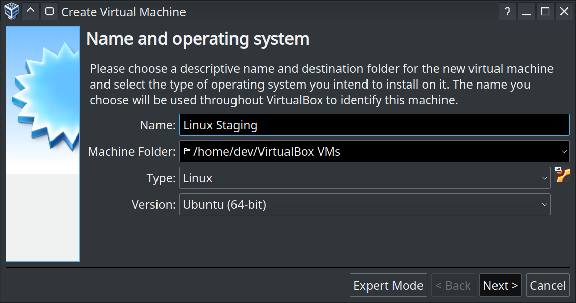 Name your virtual machine with a name that makes it apparent what that machine does. Also, change the type to Linux and the version to (Ubuntu 64-bit)