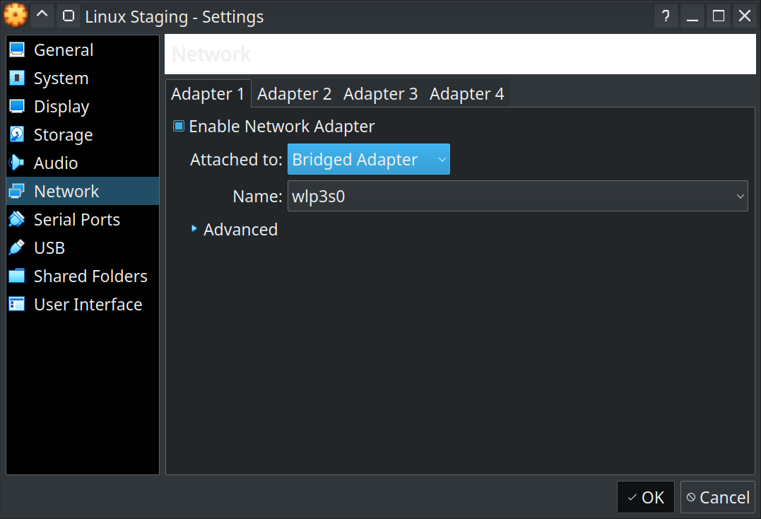 After selecting your storage settings, navigate to Network and select Attached To: Bridged Adapter.