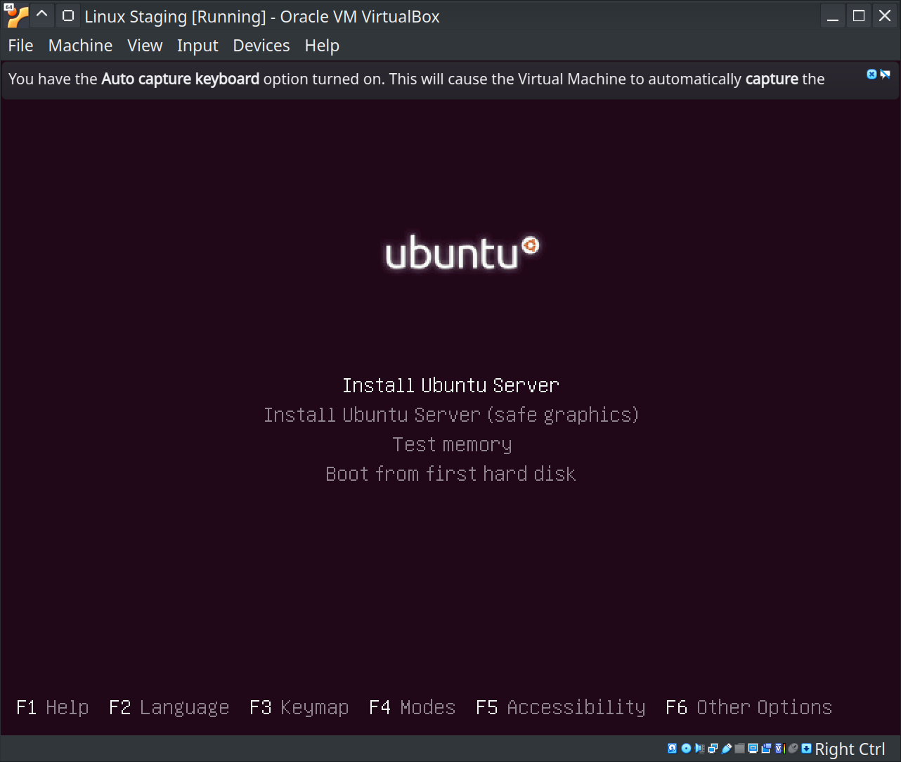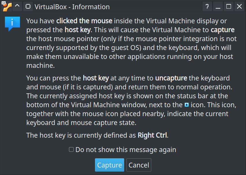 Click into the virtual machine window. You will get the following message. Pay attention to what it says, then click capture.