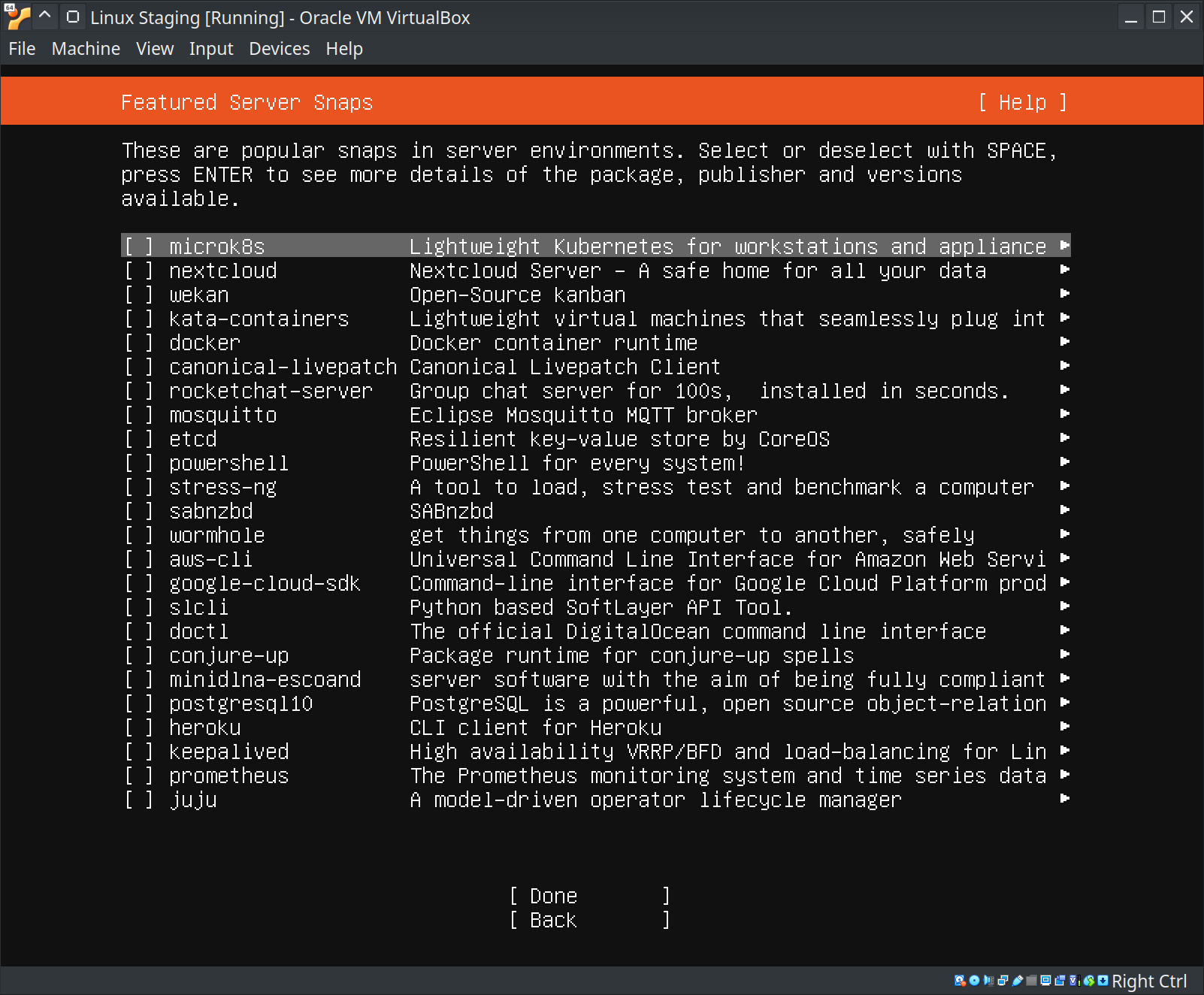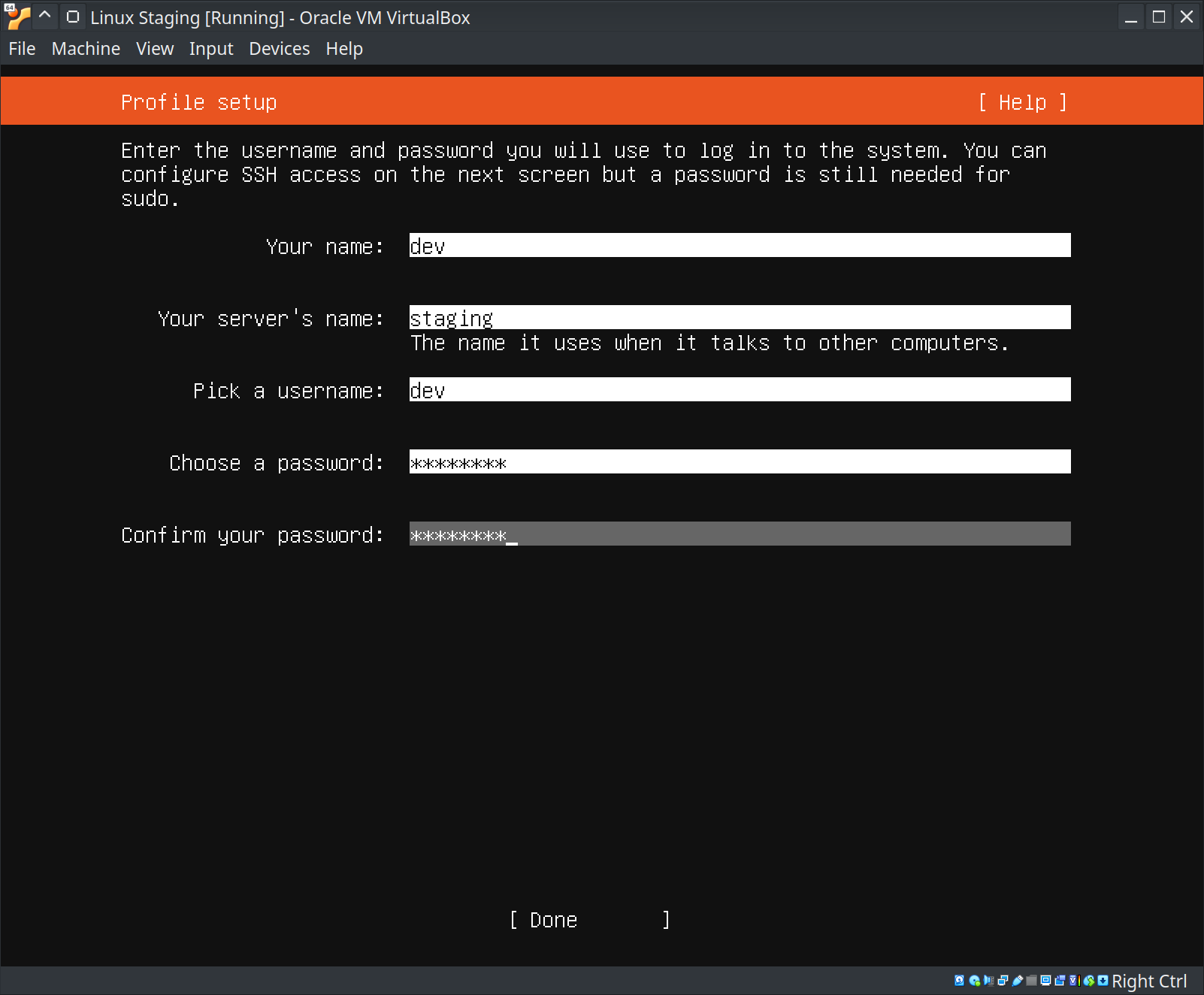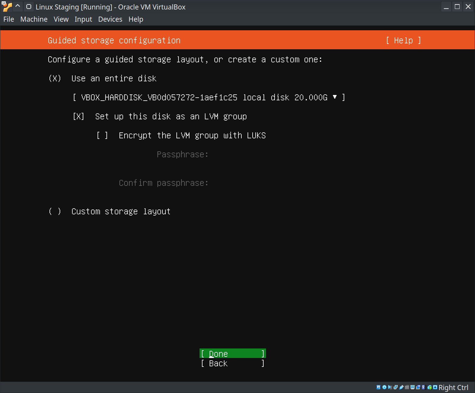 When you come to the storage configuration screen, you can use the defaults. Go ahead and use your down arrow key to move down to Done.
