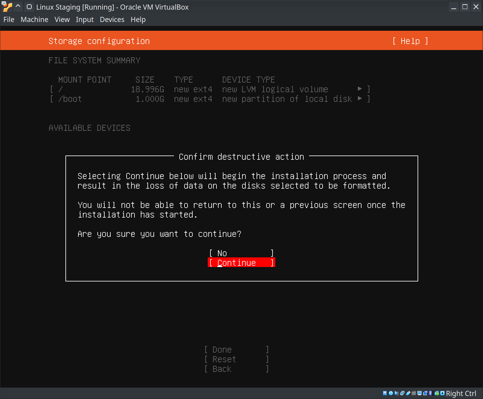 Go ahead and select Continue when you get to this point. This is basically just saying that you are about to format the virtual machine drive.